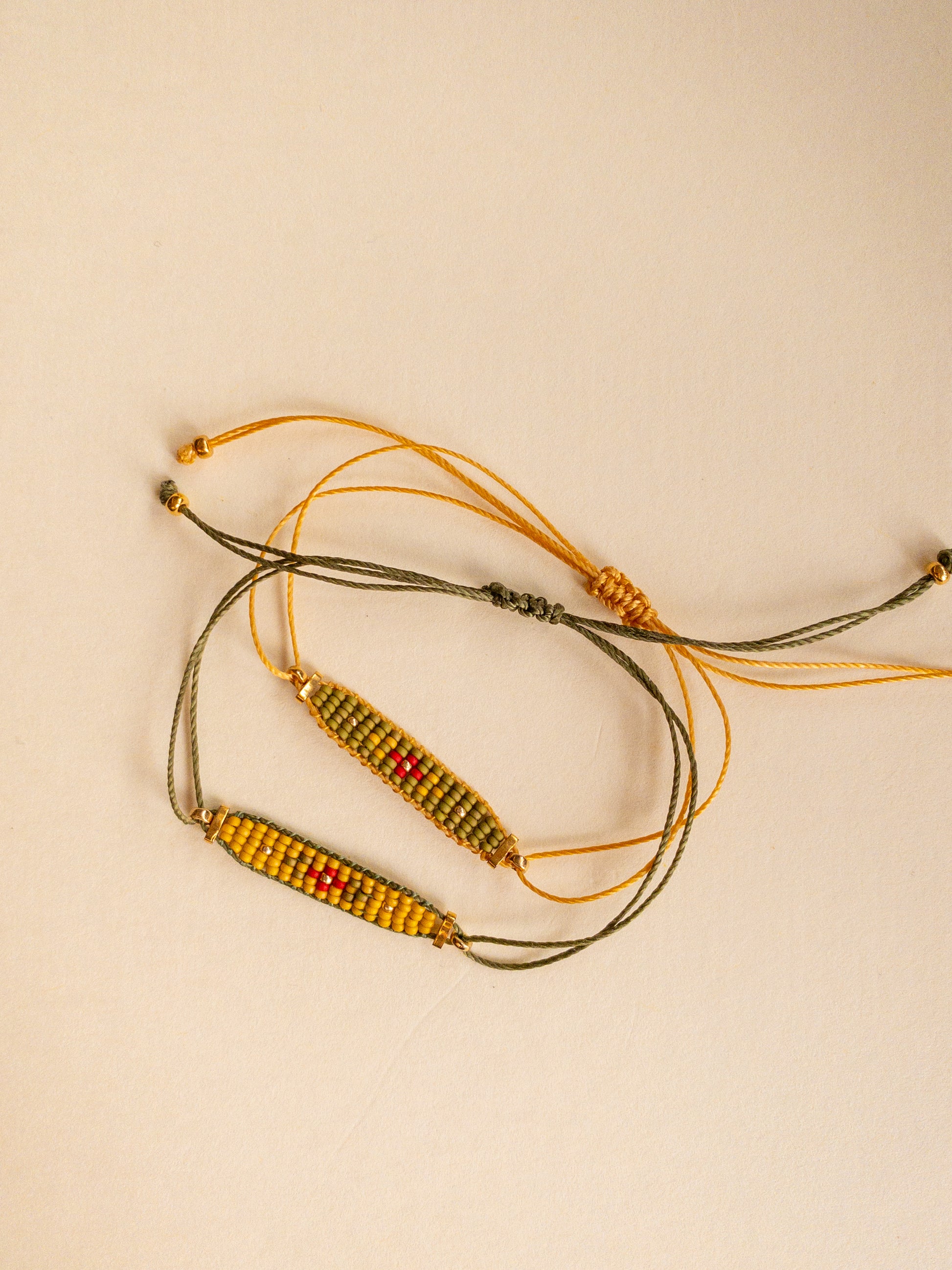 Set of 2 coordinated bracelets with a woven bead charm. An elegant but casual piece made with strong nylon cord to withstand frequent wear. Adjustable to fit most wrist sizes. Keep one and give the other to someone you love!
